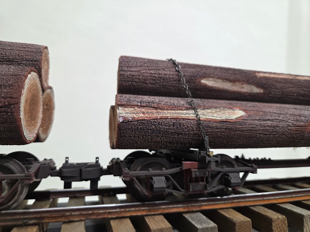Set of 5 LGB Logging Disconnects with Rooster poles. Logs are custom foam and painted.  Scale sizes, cuts and logging marks. They are the best log loads.
