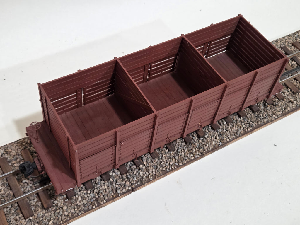 Scratchbuilt Fruit Wagon.  3 bins.  Side discharge. Truly a one of a kind model.  Accucraft trucks.  Loaded from a raised ramp by horse drawn wagons. Photos included of the prototype wagons.