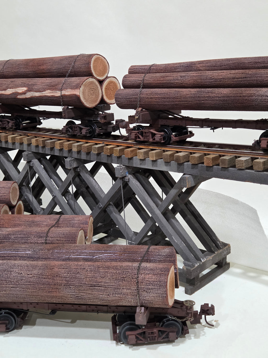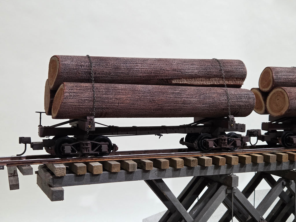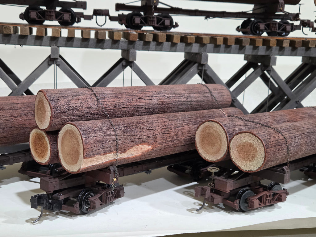 Scratchbuilt 24" Skeleton log cars with cast steel bolsters.  Plastic trucks and metal ball bearing wheels with Kadee couplers
